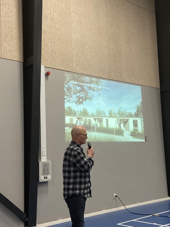 Indledningsvis gennemgik Dorthe Hovaldt fra arkitektfirmaet Hovaldt Aps det spændende nye byggeri, som arkitektfirmaet har tegnet og projekteret. Projektet indeholder i alt 18 almene boliger – fordelt med 14 stk. 3-værelses boliger på 89 – 95 m2 samt 4 stk. 2-værelses boliger på 45 m2 – i alt et boligareal på ca. 1.470 m2, som Boligselskabet Nordjylland står bag. Herudover opfører en privat bygherre 12 ejerboliger på hver 111 m2.