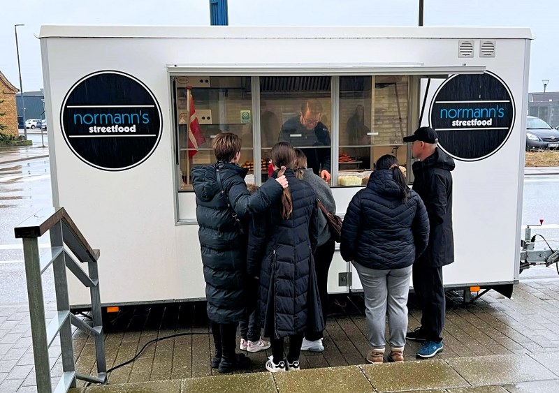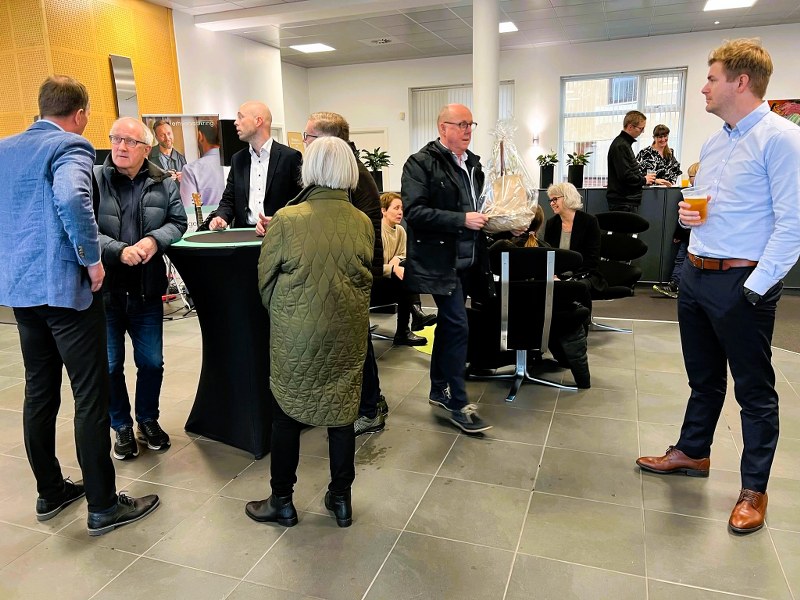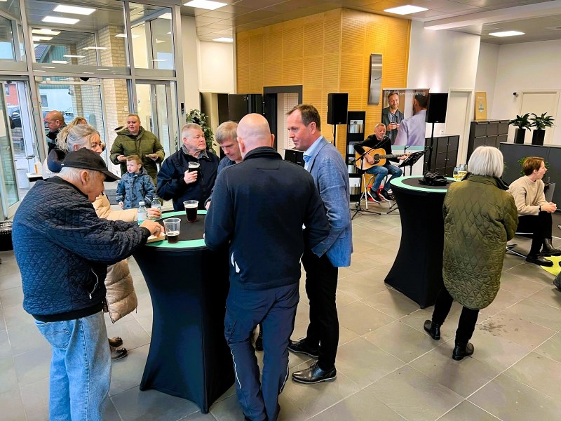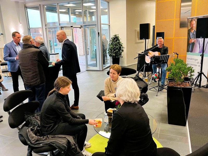 Det og meget andet fejrede René Jensen og Casper Nødgaard i deres egenskab af afdelingsdirektører for henholdsvis private og erhverv denne fredag med åbent hus, idet de havde hyret Peter Grønært til at stå for musikken, mens Mads Christian Baatz Jensen fra normann’s serverede hotdogs fra spisestedets pølsevogn ude ved fortovskanten til Jyllandsgade.