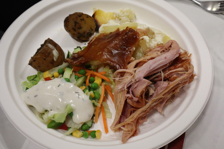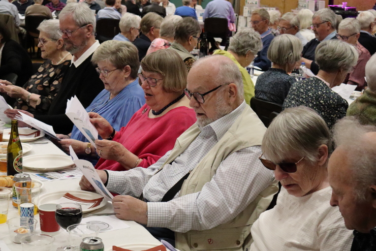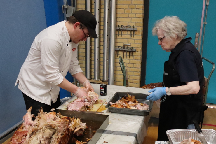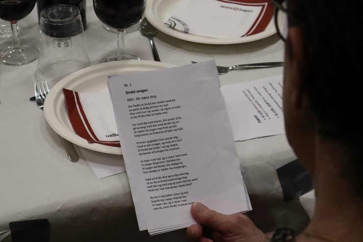 Efter velkomsttalen blev den lokale “Sindal sang” sunget med fælles stemme, inden duften af helstegt pattegris fra Bindslev Hotel bredte sig i hallen. Under middagen sørgede musikeren Anders Holm for en hyggelig og afslappet stemning med sin musik.