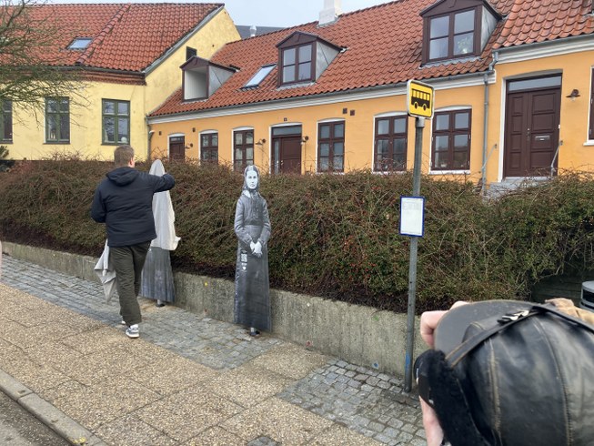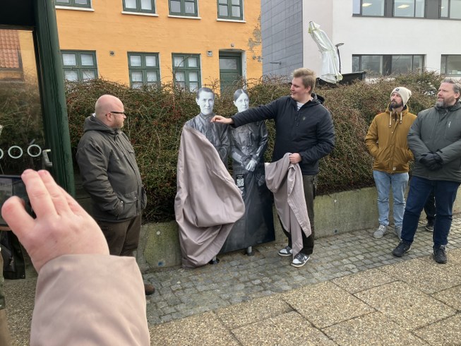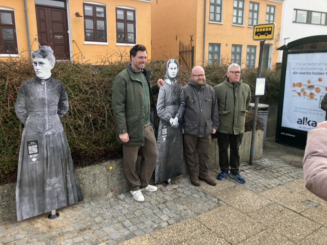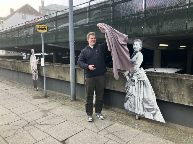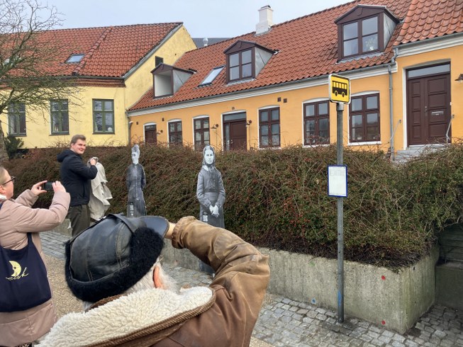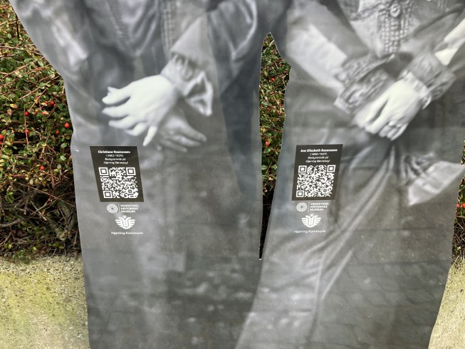 De står og venter ved stoppestedet og har en lille QR-kode på sig. Tjekker man den ud, bliver man dirigeret ind på museets hjemmeside, hvor der er en lille historie om hvem de var. Prøv det ved stoppestedet!