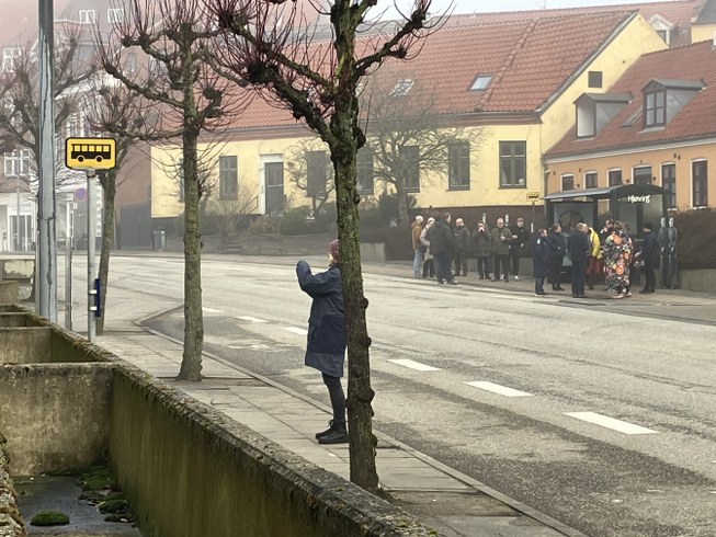 Sidst på formiddagen mandag var vi flere end normalt, der ventede på bussen i Nørregade lige bag rådhuset i Hjørring.