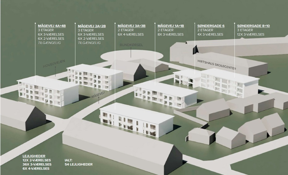 I det nye boligområde bliver de eksisterende 72 boliger i de 3 etagers blokke renoveret fra soklen, hvorefter boligområdet vil bestå af 54 boliger i størrelser fra 83 – 106 m2.