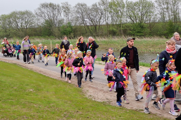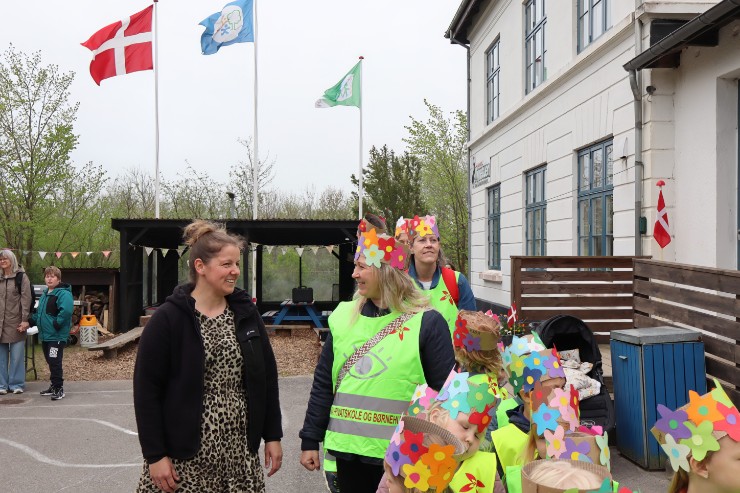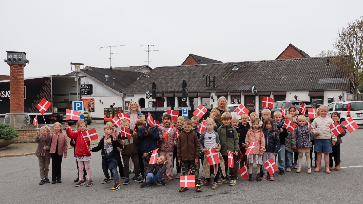 Efter den festlige rundtur omkring ældrecentrets boliger fortsatte optoget mod Nørre Torv. Her ventede en særlig velkomst i form af “Veteranerne” – børn fra 0. til 3. klasse, som tidligere selv havde været en del af karnevalet. De stod klar med flag og heppede på de yngre deltagere, inden optoget vendte tilbage til Myretuen.