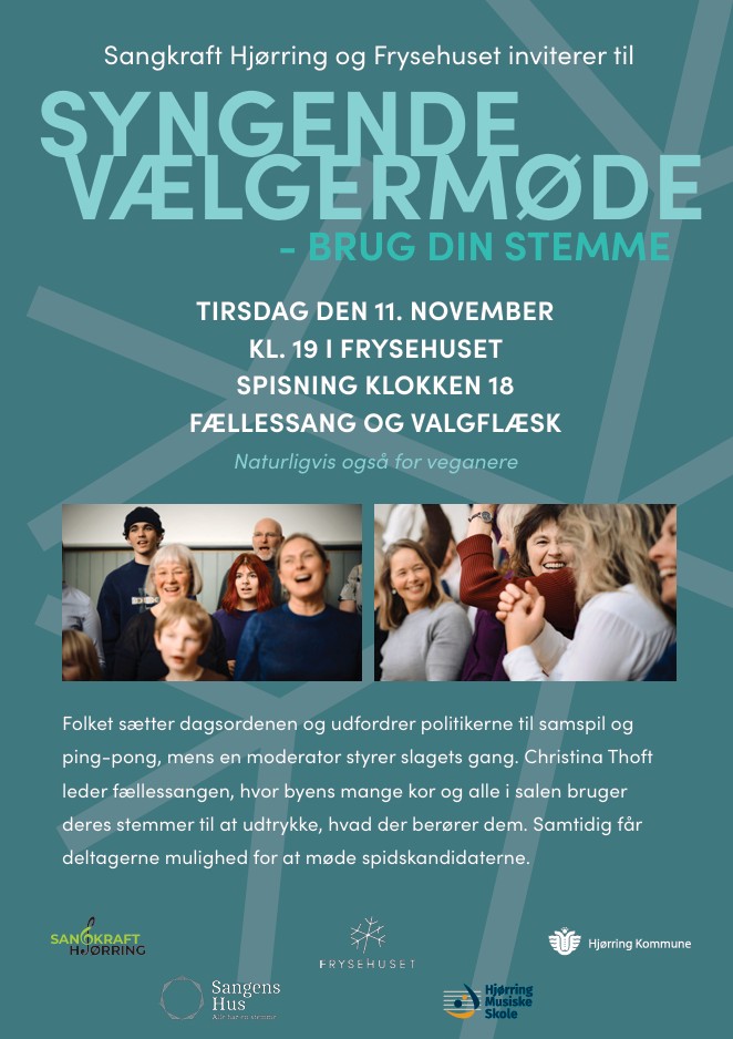 Sangkraft Hjørring og Hjørrings nye mødested Frysehuset inviterer derfor til et Syngende Vælgermøde tirsdag den 11. november kl. 19.00. Her skal tonen ikke kun skærpes – men også samstemmes. Med udgangspunkt i fællessang sættes der fokus på de emner, der optager Hjørrings borgere: