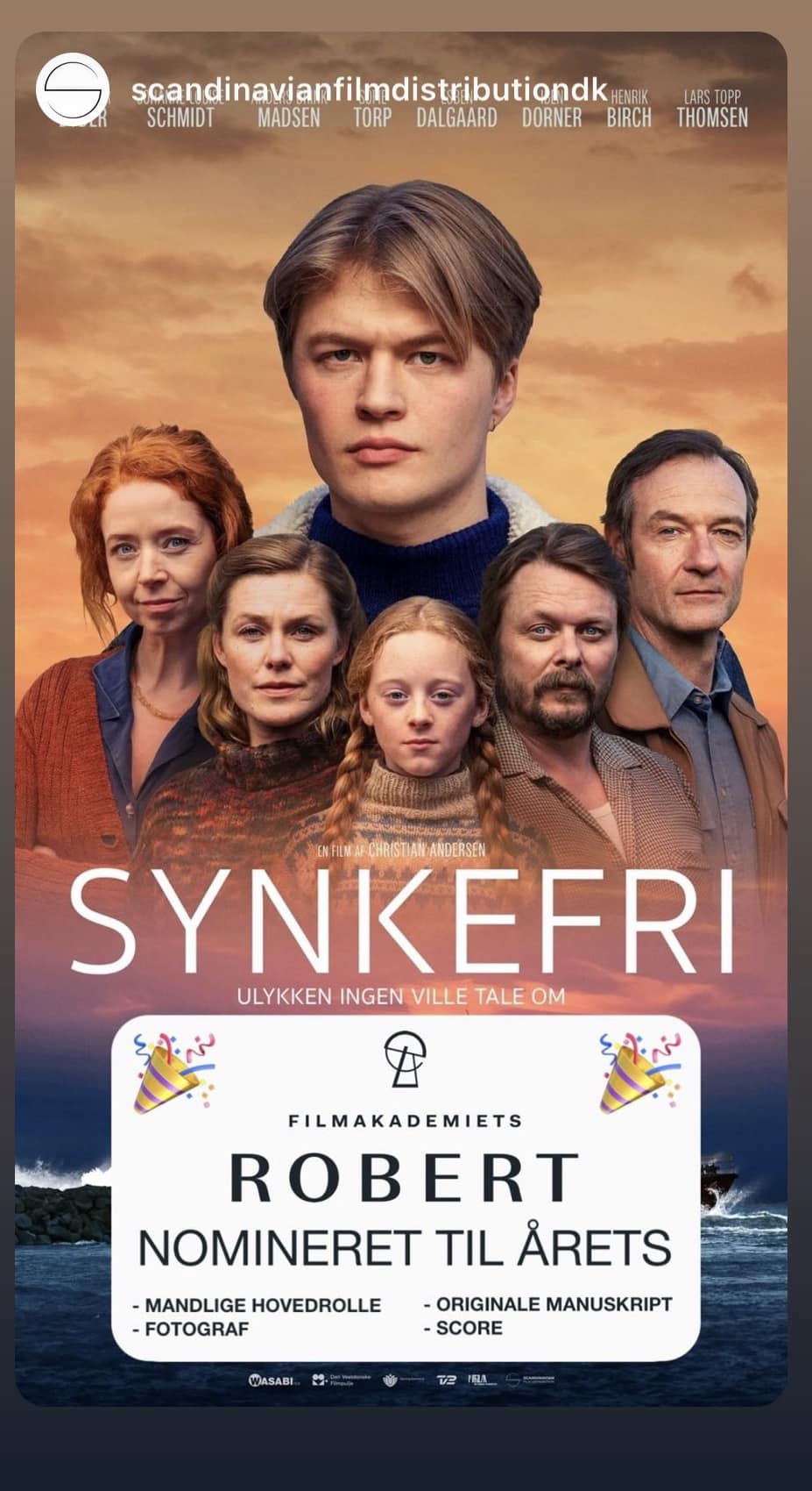 Ikke bare er Christian Andersen og Martin Strange-Hansen nomineret til Robert Prisen som bedste manuskriptforfattere, men unge Sylvester Byder er tillige nomineret til årets mandlige hovedrolle i samme Synkefri.