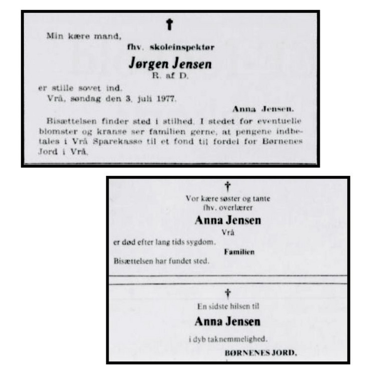 Anna og Jørgen var begge født i 1893, og da Jørgen døde i 1977, gik der ikke mange måneder før Anna også gik bort i 1978. I stedet for blomster og kranse ønskede de begge, at folk ville indbetale penge til en fond til fordel for Børnenes Jord i Vrå.