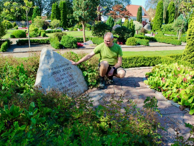 Den flotte mand i grøn trøje er graver Mads Lie Jensen fra Vrå Kirkegård. På billedet med tulipanerne kan du se gravstenen, før den blev renoveret.