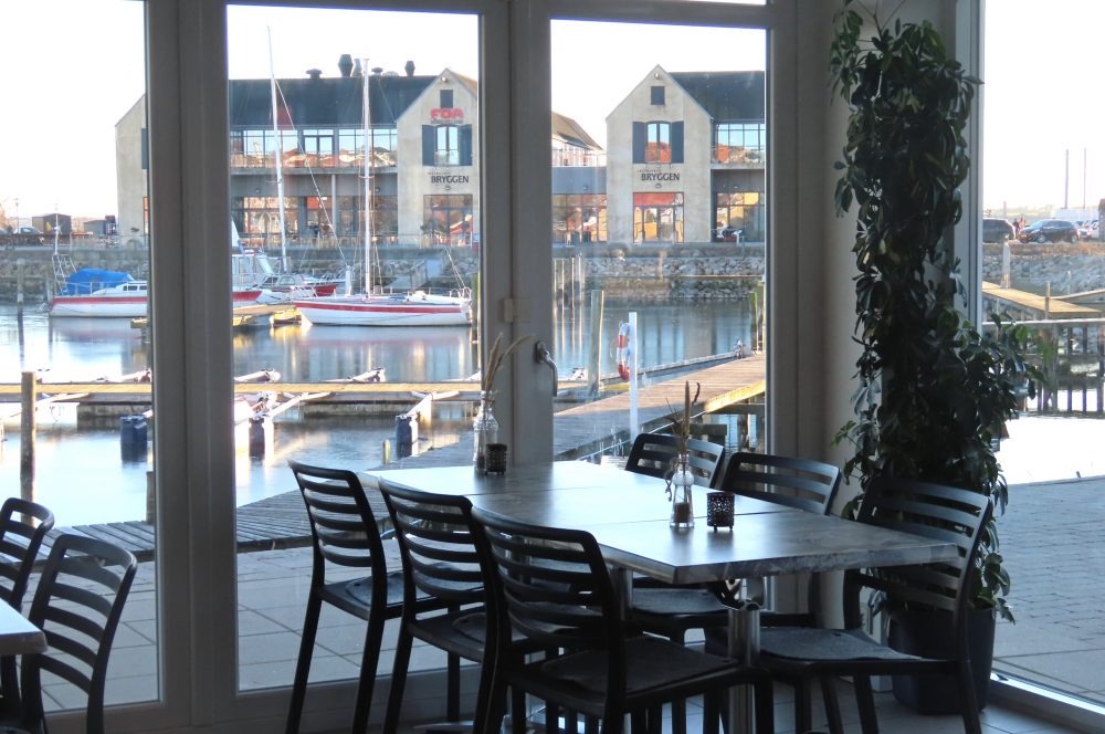 Vi kigger ud over havnen uden for Fiskehuset. Michael smiler: