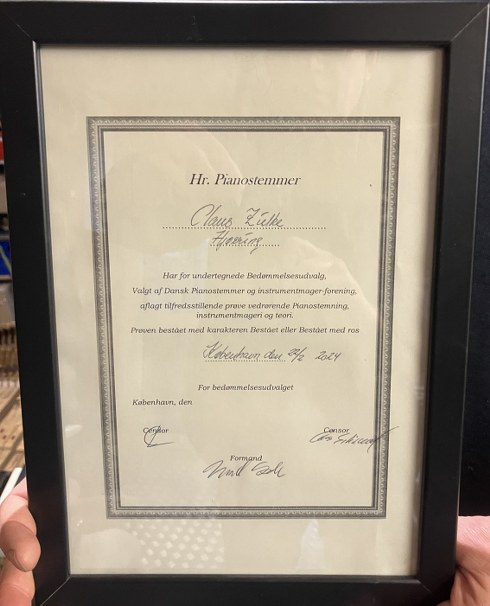 Pianisten, som også er klaveransvarlig på Hjørring Musikskole, har netop ”aflagt tilfredsstillende prøve vedrørende Pianostemning, instrumentmageri og teori”.