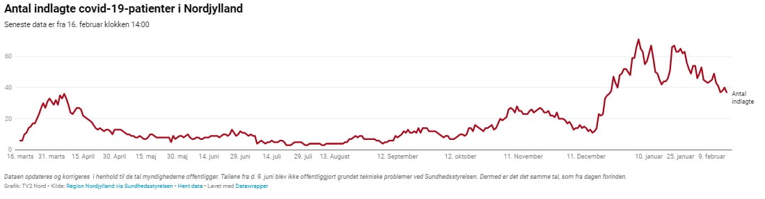 Der er registreret to dødsfald i regionen, hvilket er en stigning på én. I øjeblikket er der 37 indlagte på regionens hospitaler. Dét tal var mandag på 40 personer.