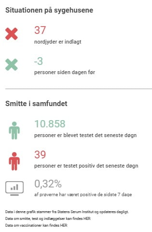 I Region Nordjylland er der det seneste døgn registreret 39 tilfælde med covid-19. Det er det samme antal som mandagens tal. Det viser de seneste opgørelser fra Statens Serum Institut.