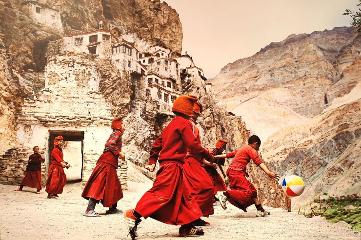 Unge tibetanske munke spiller badebold i bjergene…