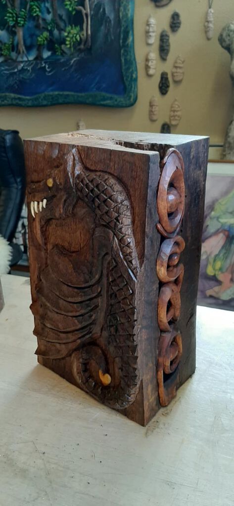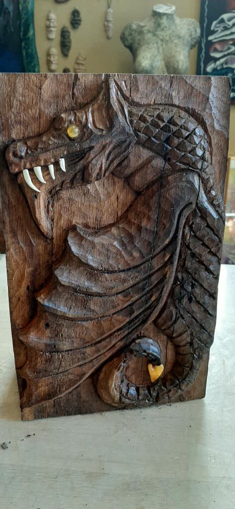 Der skulle være lidt viking over noget af det. Den ene er Midgårdsormen med øjne af rav. Der er en drage og igen med ravøjne  og rav på halen. Ligesom der er Freya med sin frugtbarhed.