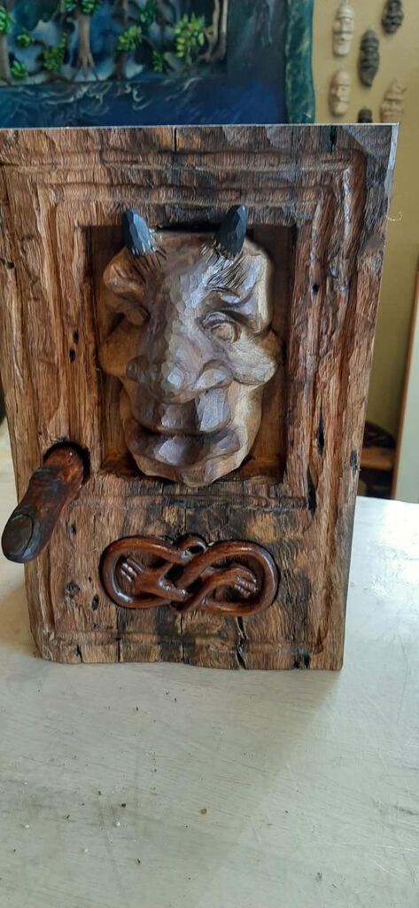 – Det kan man kalde træ med historie. Jeg har haft frie hænder, men med nogle ønsker fra kunden. Det var ikke alt træet, jeg kunne skære i på grund af søm og alder, men jeg kunne tilføje ved at lave ting i andre trætyper og sætte på, og det passede mig fint, for det er jo på den måde jeg arbejder, uddyber Henrik Woodpek.