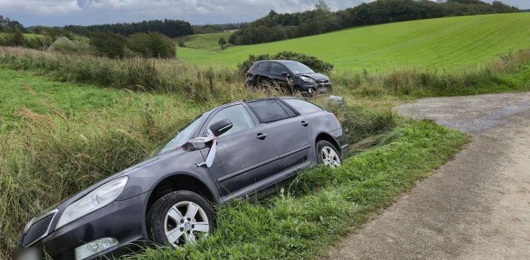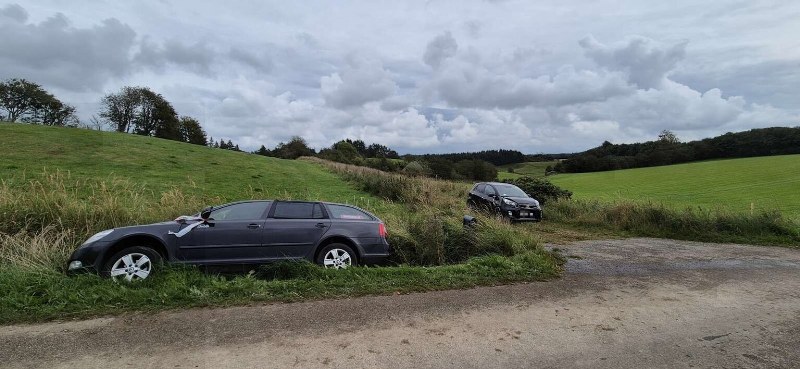 På stedet ligger den ene bil i grøften, mens en mindre bil holder på en sidevej med skader på fronten. Begge biler er afmærket med politiets afspærringsbånd.