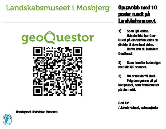 På Landskabs- og Landbrugsmuseet i Mosbjerg er der lavet en såkaldt GeoQuest. Det er et opgaveløb med 10 poster, som bringer dig rundt i landskabet. Det kræver blot at du har en nyere mobiltelefon. Med mobiltelefonen scanner du nedenstående QR kode.