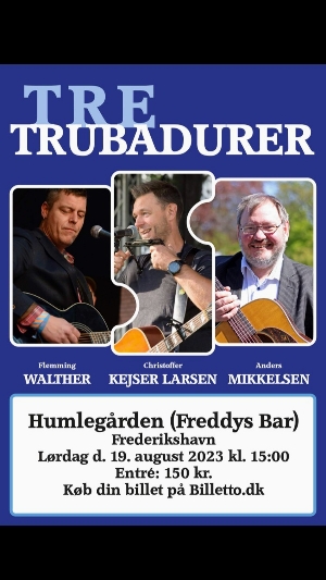 Få en uforglemmelig musikalsk eftermiddag i morgen, lørdag den 19. august klokken 15.00 i den hyggelige gårdhave, Humlehaven, som er en del af Freddy’s Bar i Frederikshavn, hvor man kan opleve hele tre danske troubadourer.