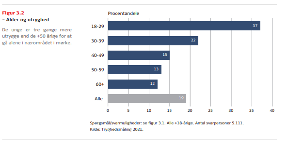 ”Selvom tryghed fylder stadig mere i den politiske og offentlige debat, ser vi, at utrygheden generelt stiger i det danske samfund. Og der er noget, der tyder på, at særligt de unge bliver ramt. Blandt den gruppe slår frygten for at blive udsat for vold eller fysiske overgreb særlig hårdt. Godt hver femte unge kvinde svarer i vores måling, at de er utrygge for at blive udsat for seksuelle overgreb. Ligesom der er tre gange højere utryghed i aldersgrupperne op til 30 år for at gå alene i nærområdet i mørke, som hos dem, der har passeret 50 år. Det er rekordhøje tal”, siger Anders Hede, forskningschef i TrygFonden og fortsætter:
