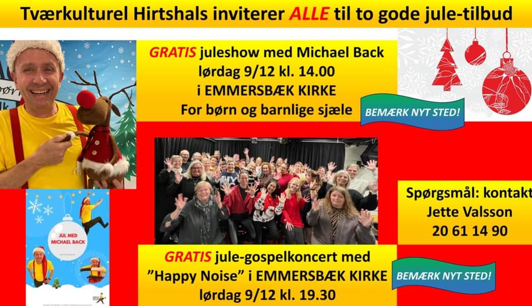Kl. 14.00 er der julehygge og julesjov med besøg af Michael Back i Emmersbæk Kirke. De begynder med æbleskiver, kaffe, the, saftevand mv.