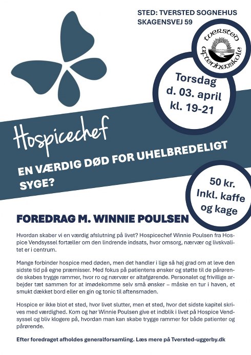 Hospicechef Winnie Poulsen fra Hospice Vendsyssel fortæller med overskriften ”En værdig død for uhelbredelig syge?” om den lindrende indsats, hvor omsorg, nærvær og livskvalitet er i fokus. Hvordan skaber vi en værdig afslutning på livet?