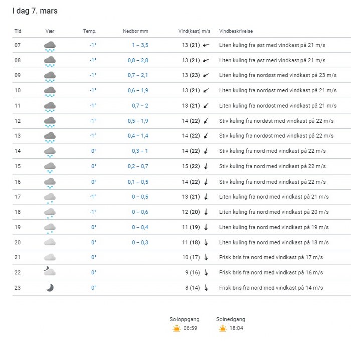 Først svag til jævn vind mest omkring øst, men i løbet af formiddagen tiltagende hård vind til kuling fra nord og nordvest og især ved kysterne med vindstød op til stormstyrke. Ud på eftermiddagen efterhånden lidt aftagende vind. Temperaturer omkring frysepunktet.