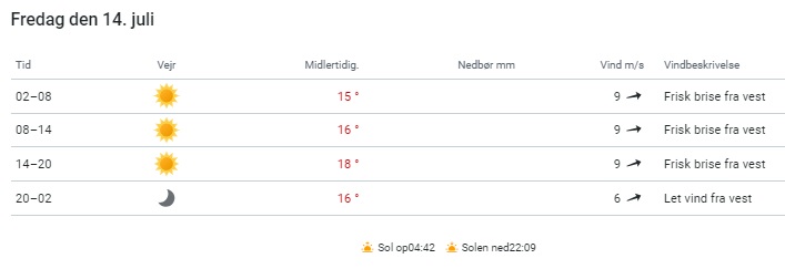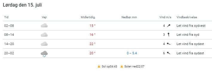 Hvis ellers vejrguderne holder, hvad de norske meteorologer lover ovenfor, ser det i hvert fald lovende ud med vejrudsigten for Tornby Strand fra YR.NO. Høj sol fredag og ganske vist overskyet lørdag, men til gengæld let vind med kun 3 til 4 meter i sekundet. Lørdag aften er der desuden udsigt til lidt regn, men da er alle gæsterne alligevel i teltet og bådhuset for at at spise og dernæst høre No Good.