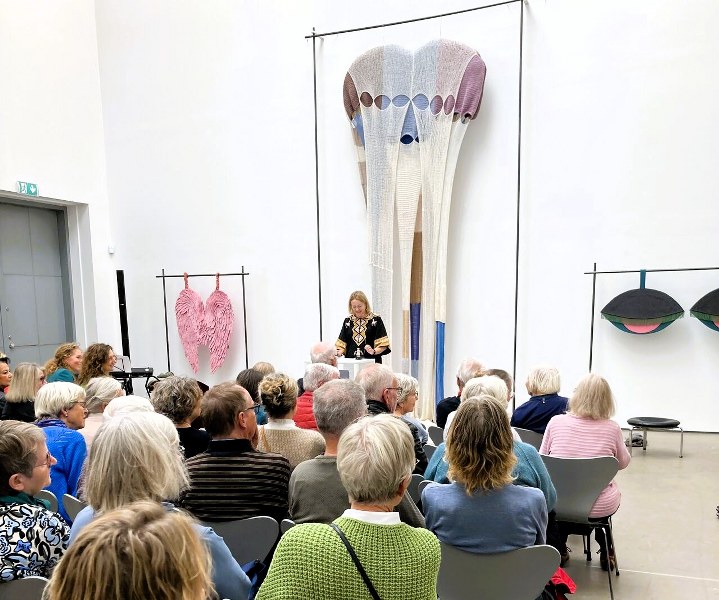 Museumsdirektør Sine Kildeberg bød velkommen og satte scenen for en eftermiddag i tekstilkunstens tegn. Herefter indtog strikdesigner og indehaver af det populære brand PetiteKnit, Mette Wendelboe Okkels, talerstolen. Med sin passion for håndværk og æstetik satte hun ord på udstillingens betydning og potentiale.