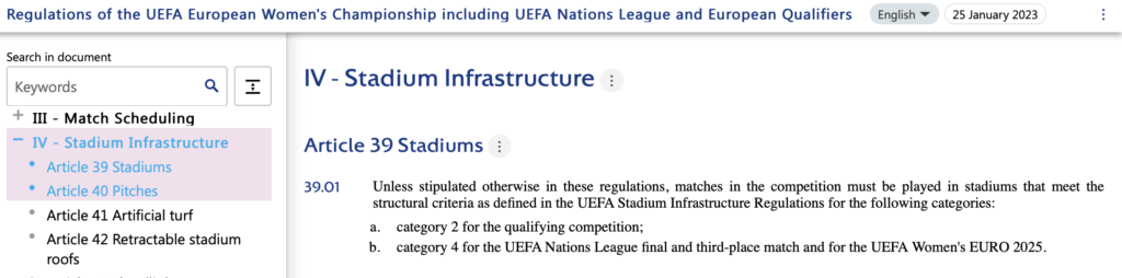 For herrernes vedkommende skal belysningen være på mindst 1500 lux fra play-off, mens den for kvindernes vedkommende kun skal være på 800 lux, indtil de afsluttende runder. Lidt polemisk kan man altså konkludere, at kvindefodbold kan afvikles ved dæmpet belysning.