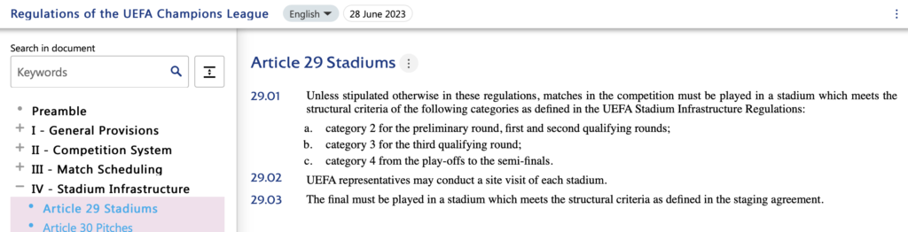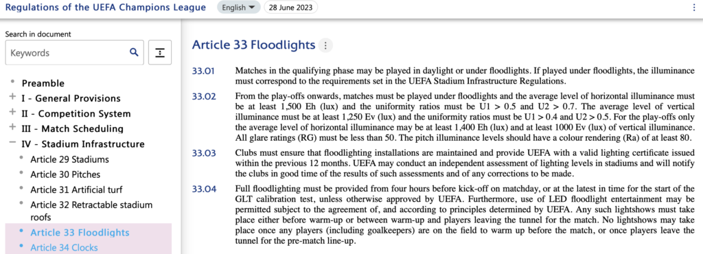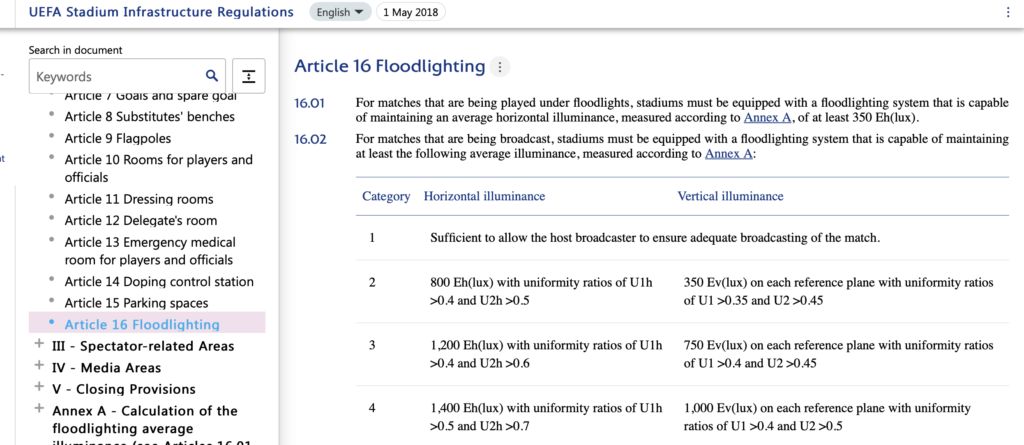 Herunder ses UEFAs regulativ for herrernes Champinons League, hvoraf det fremgår at der skal være 1500 lux fra play-off.