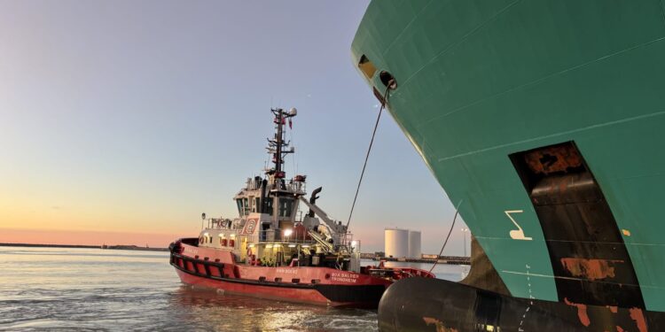 Klokken 16.40 søndag aften blev Smyril Lines fragtskib Glyvursnes, der for nylig blev ramt af en tragisk brand slæbt ud af Hirtshals Havn til reparation i Frederikshavn.