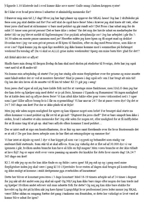 Herunder har jeg vedhæftet brev, jeg skrev klokken 02 om natten, efter første dag, som jeg afleverede til de kontrollanter næste dag klokken 10 og fik dem til at læse det og aflevere til deres chefer!