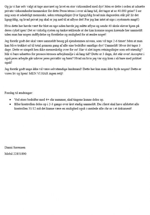 Og igen til slut vil jeg nævne; dette har intet med kontrollanterne at gøre. De var fair, og der var god dialog og lyttende igennem alle tre dage! De gør bare deres arbejde de er ansat til! Det er systemet der har glemt at følge med udviklingen i dansk landbrug! Vores virksomheder, der vokser, vi kan ikke bare tage tre til syv dage ud uden planlægning!