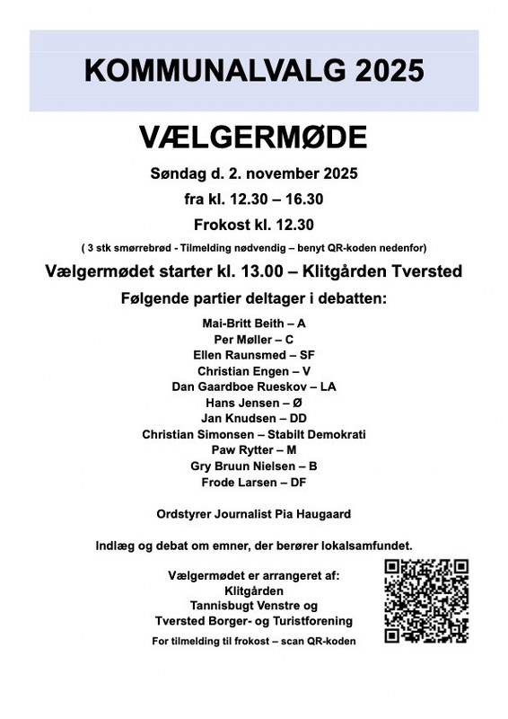 Søndag den 2. november kl. 12.30 til 16.30 inviteres alle interesserede til vælgermøde på Klitgården i Tversted.