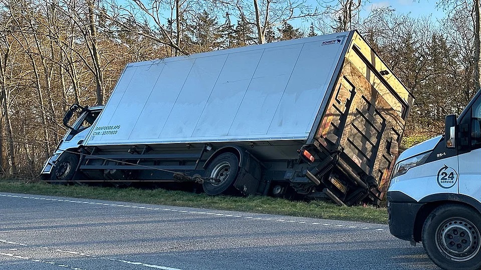 Som billederne viser, lå lastbilen ved siden af vejen, hvorfra den var ved at blive forsøgt trukket op igen.