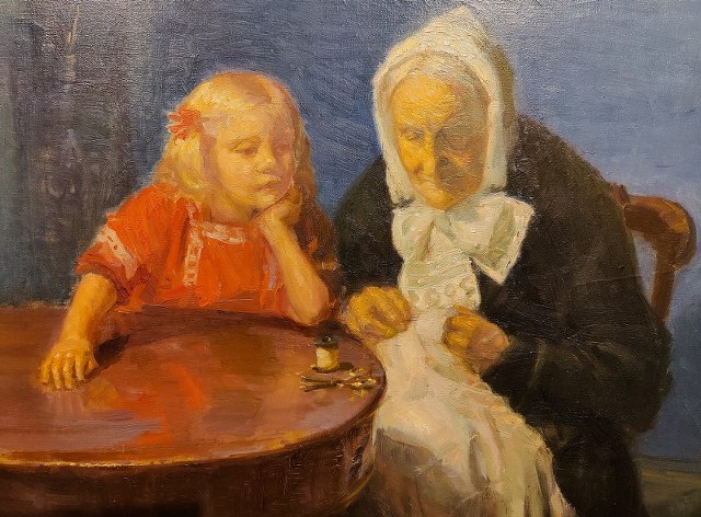 Anna Anchers fine billede har titlen BEDSTEMOR UNDERHOLDES… personligt tænker jeg på de splitsekunders varme mellem generationerne… ubetalelige øjeblikke… lige om lidt siger pigen: ”Du er godt nok dygtig, Bedste”…