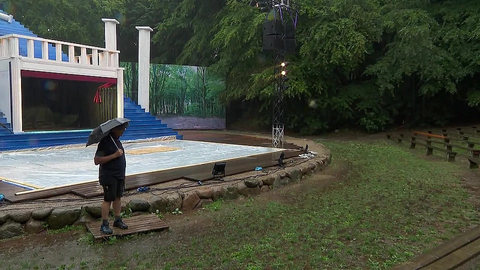 Mandag formiddag var Hjørring Sommerspil i en kamp mod tiden for at tildække så meget som muligt af scenen, inden det kraftige regnvejr rullede ind over Nordjylland, skriver TV2 Nord.