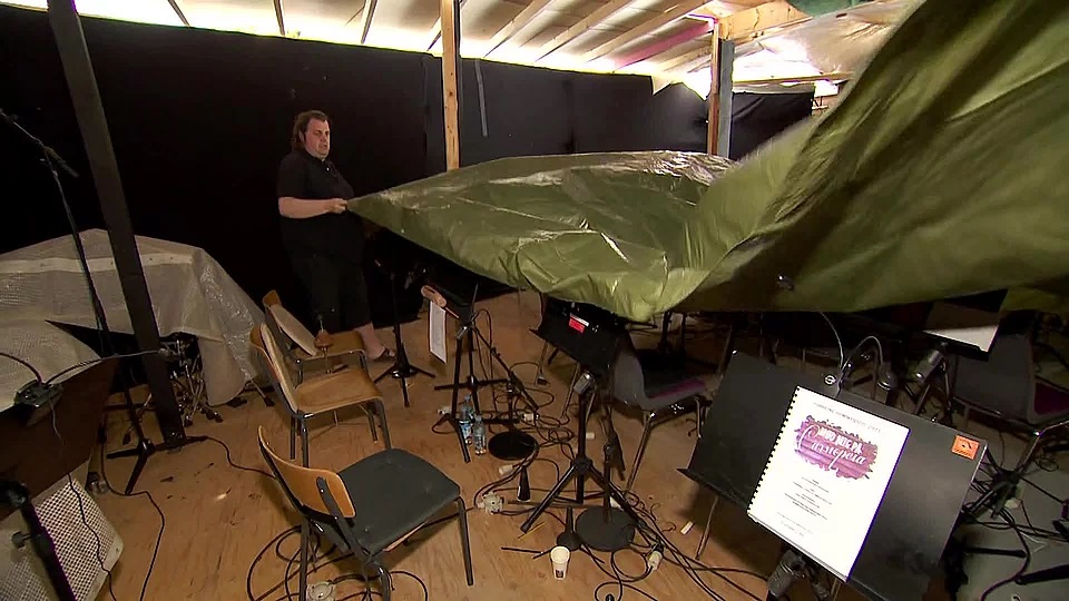 De helt store presenninger var fundet frem for at holde det hele tørt. Forestillingen står nemlig til at starte klokken 20, og mandag eftermiddag var de stadig ikke sikre på, at det ville blive til noget. Men det blev det heldigvis.