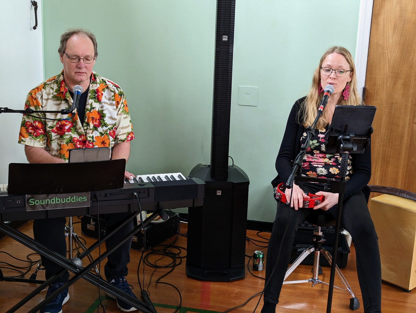 Gymnastiksalen var omdannet til en hyggelig cafe med salg af kaffe, te, kager og franskbrød med pålæg, som kunne indtages til hyggelig livemusik fra Soundbuddies ved Heidi og Søren.