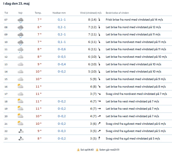 Vejrprognosen fra YR.NO for fredag i under Naturmødet i Hirtshals.