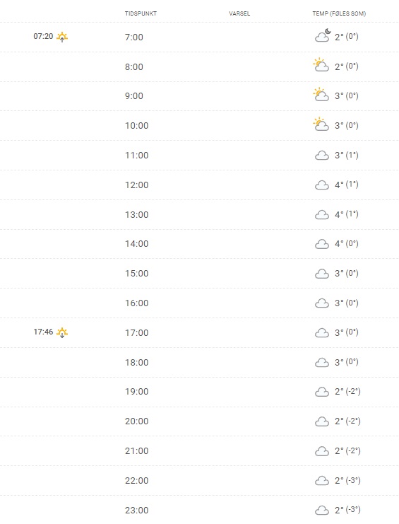 Det bliver en rolig dag, hvor vinden nærmest ikke vil kunne mærkes, der vil være overskyet med mulighed for at solen kan skinne ind imellem, og så vil temperaturen ligge omkring de to til tre grader det meste af dagen.