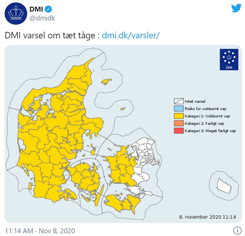 DMI opfordrer i hvert fald de nordjyske billister til at køre ekstra forsigtigt fra klokken 17. Her vil der nemlig komme en tæt tåge ind over Nordjylland. Det vil betyde, at der flere steder vil være en sigtbarhed på under 100 meter, og derfor skal billister forvente en øget transporttid, oplyser DMI.