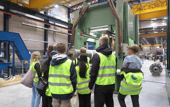 Hos MarineShaft var det elever fra Bagterp Skole i Hjørring, som kom cyklende på besøg. Virkomhedens ingeniør Casper Olsen tog sig godt af eleverne, der også fik en demonstration af vores 7 meter høje og 180 ton tunge hydrauiske presse. I dagens anledning var det ikke en aksel, som skulle rettes, men tomme dåsesodavand, der blev presset med 4000 ton. Det gjorde tydeligvis et vist indtryk.